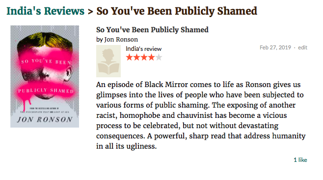 So, take a peep at my reviews and prepared to be mildly amused (I hope). Cheeky secret, I have reviewed two books I ‘technically’ haven’t read.I had to write reviews for work so thought I’d take a stab at reviewing something at a first glance – I’m crazy like that. Please try and guess which ones…Oh and follow me on Goodreads!!!! (@india_alessandra)